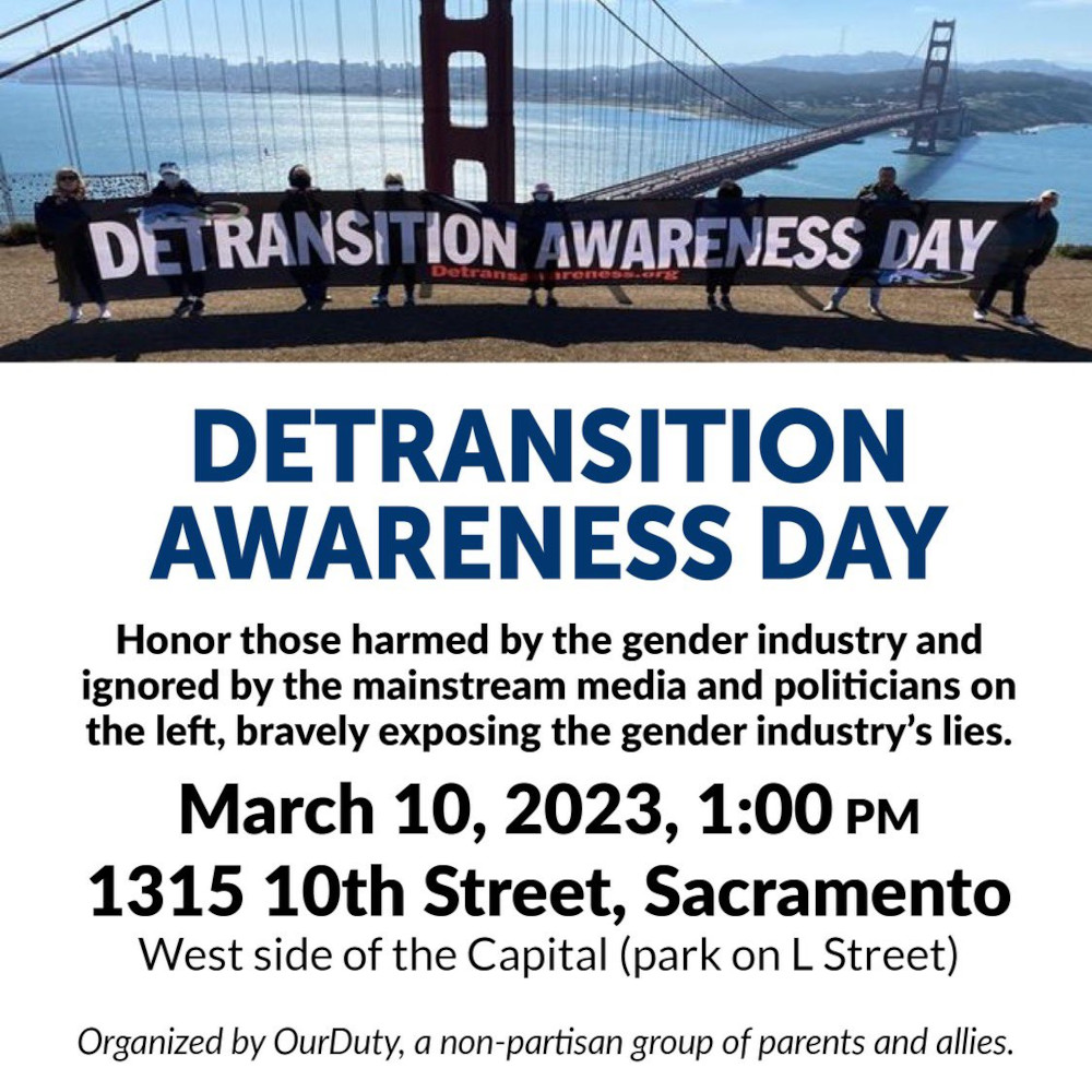 Addendum – March 2, 2023: I came across a tweet by detransition activist Chloe Cole announcing a “Detransition Awareness Day” on March 10th in Sacramento. Frankly, this is going to attract a huge number of protestors and no doubt things will get very ugly. That said, Ms. Cole has a right to express her opinion at a peaceful gathering, no matter how upsetting that opinion is to others. She’s also got the experiences to back it up.