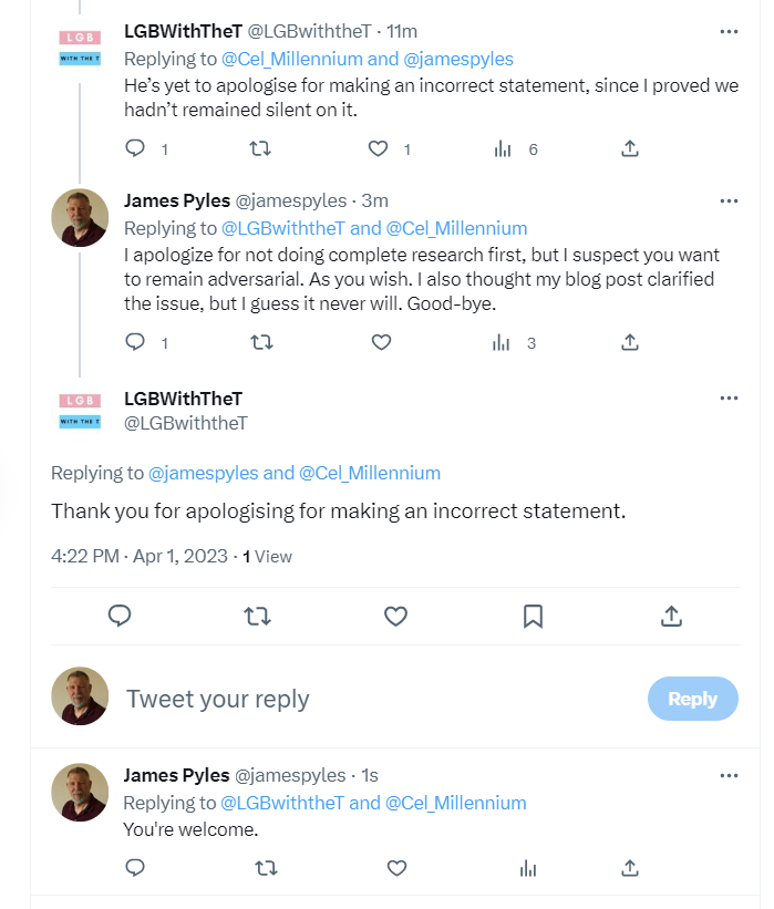 Addendum – April 1, 2023: I sent LGBWithTheT a link to this blog post. I didn’t know how they’d react but since I mentioned them so prominently, I thought I owed it to them. This is what I got back as a response.