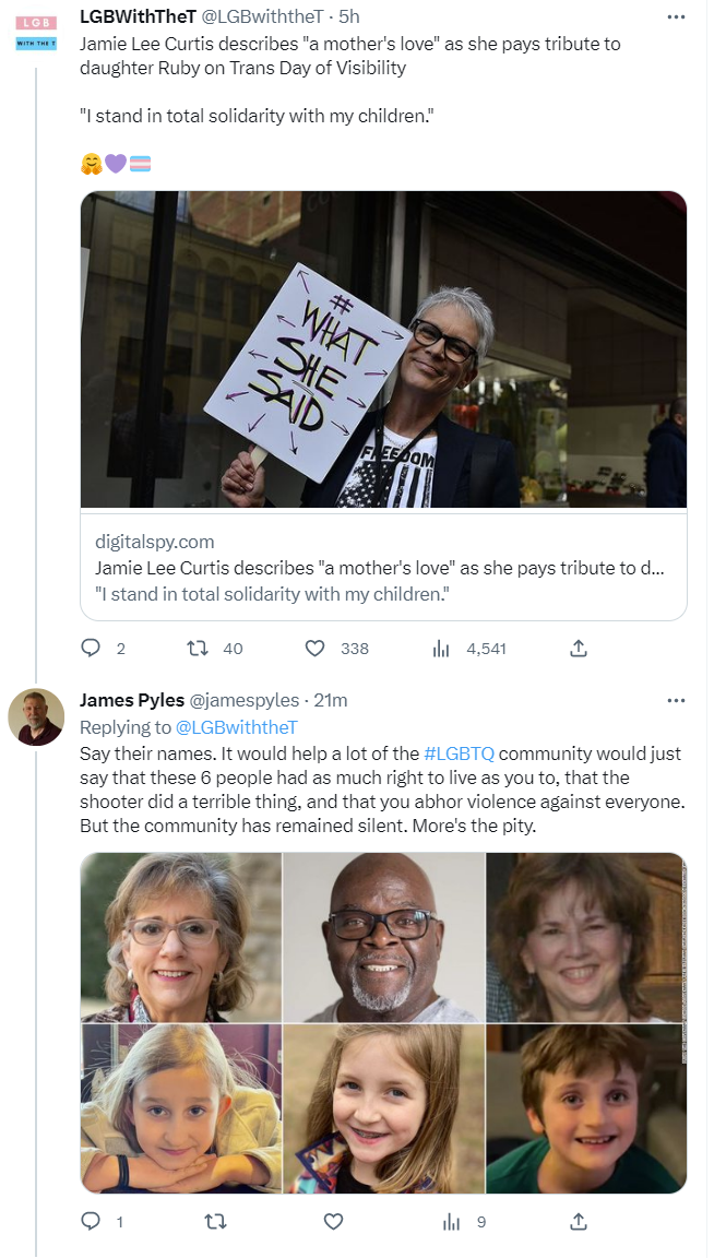 All I asked was for the LGBTQ community to issue a statement such as “We are in solidarity with the victims, families, and friends of the Covenant School shooting. The shooter’s actions were wrong and criminal and we don’t support them. The victims had as much right to live as we do.”