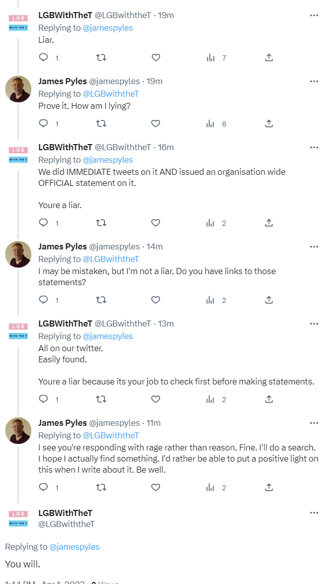 I got no responses at all (I didn’t expect any) until I posted on LGBWithTheT‘s twitter account. The screen shots following illustrates the conversation.