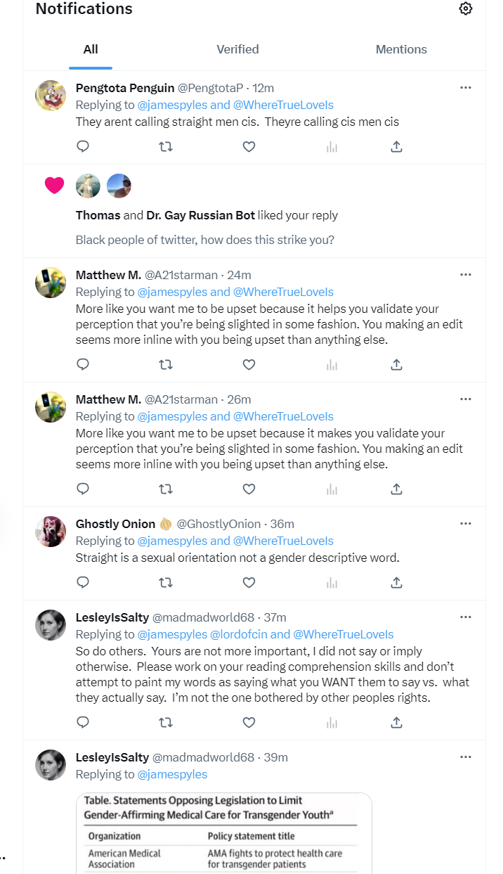 No one was interested in that. Although they wouldn’t say the quiet part out loud, it is apparent that they really want me to call myself “Cis” because it serves their interests and needs. Put another way, these individuals and groups MUST control the label for my sexual and gender identity to make themselves feel better. Otherwise, it’s bigoted, wrong, nasty, unfair, and so on. I preserved the screenshots at the top but you can see the individual tweets: